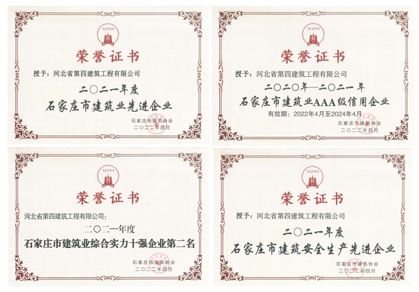 近日,公司在建筑施工领域再获表彰。经专家组严格评审,石家庄市建筑协会研究决定,授予公司2021年度“石家庄市建筑业综合实力十强企业”“石家庄市建筑业AAA级信用企业”“石家庄市建筑业先进企业”“安全生产先进企业”,四项荣誉在获奖榜单中均名列前茅。同时,张新煜被评为“优秀企业经理”、梁复被评为“优秀安全总监”、陈增顺被评为“优秀总工程师”、李青等22人被评为“优秀项目经理”,聂玉朝等2人被评为“安全生产先进工作者”。