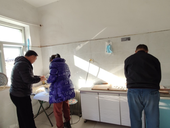 上午十一点半,王建忠亲自调饺子馅,依次放盐、姜末、酱油、料酒、香油,并不断搅拌,直至肉末和白菜相互融合。分公司职工各自分组,饺子馅分两份,擀面杖准备两根。厨房里,擀面杖快速地转动着,一双双手用力地捏着,大家井然有序,忙得不亦乐乎。每个人手艺不同,虽然包的饺子各具形态,擀的面皮儿薄厚、大小不一,但都是职工的心意。在此过程中,大家互相传授包饺子、擀皮儿的经验,食堂充满欢乐、温馨的气氛。
